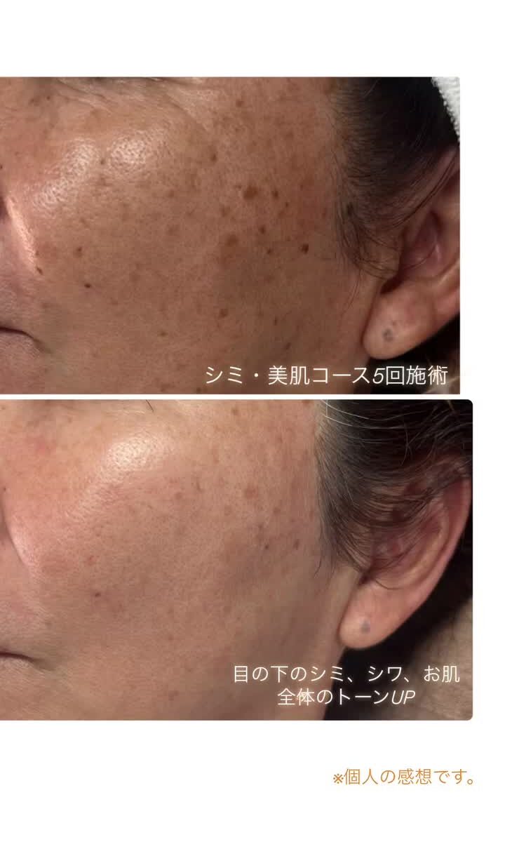 目の下のシミが薄くなって、肌全体のトーンが明るく均一になっているんです。